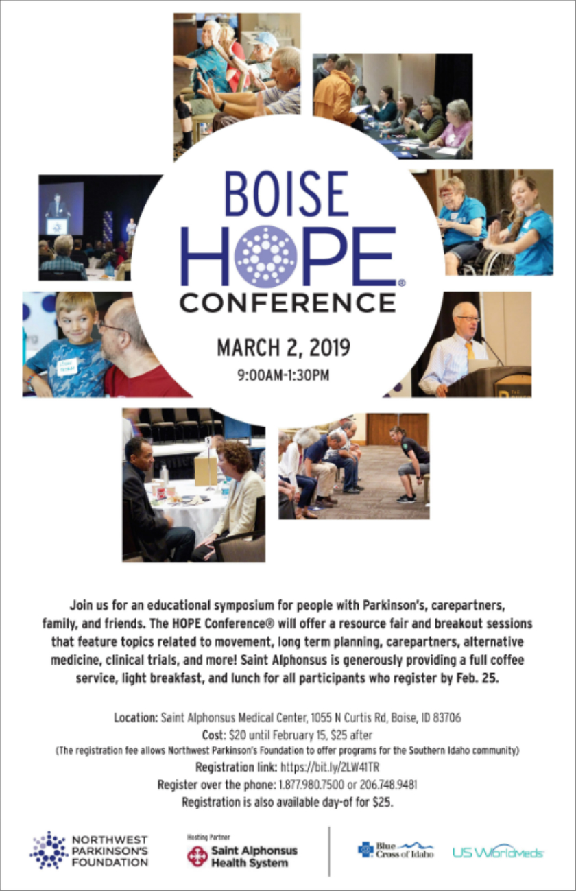 Join us for an educational symposium for people with Parkinson’s, carepartners, family, and friends. The HOPE Conference® will offer a resource fair and breakout sessions that feature topics related to movement, long term planning, carepartners, alternative medicine, clinical trials, and more! Saint Alphonsus is generously providing a full coffee service, light breakfast, and lunch for all participants who register by Feb. 25.