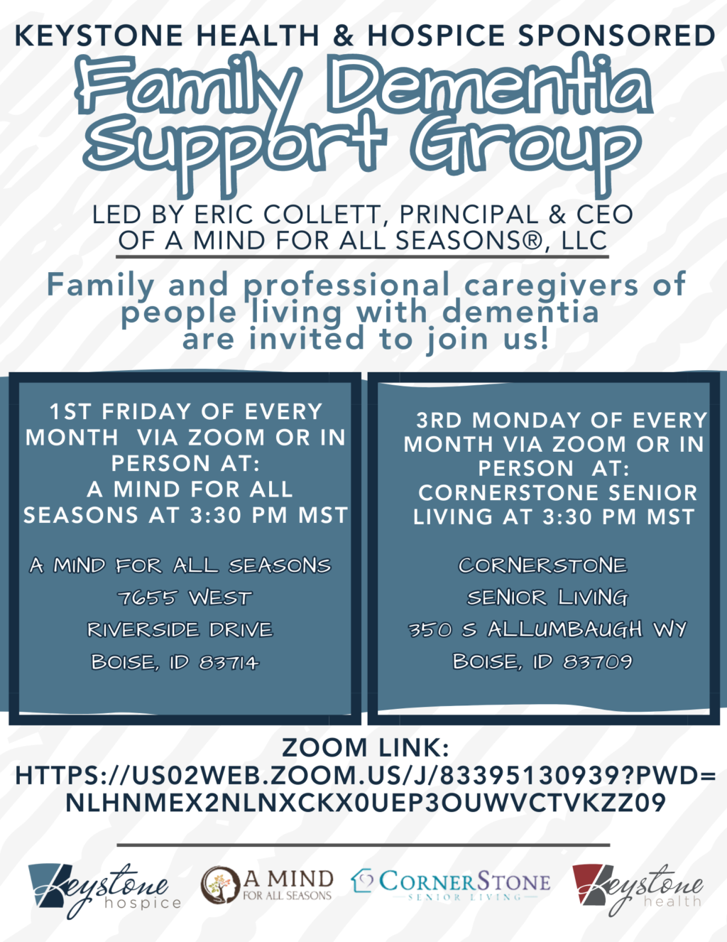 This is your invitation to this month’s support groups. This group will now meet at A Mind For All Seasons office located at 7655 West Riverside Drive, Boise, Idaho 83714 and at CornerStone Senior Living located at 350 S. Allumbaugh Way, Boise, Idaho 83709 or by Zoom. The meetings are always the 1st Friday of the month from 3:30 PM – 4:30 PM and the 3rd Monday from 3:30 PM – 4:30 PM.