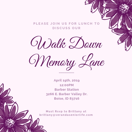 Please join us for a lunch to discuss our Walk Down Memory Lane. RSVP to Brittany at brittany@verandaseniorlife.com.